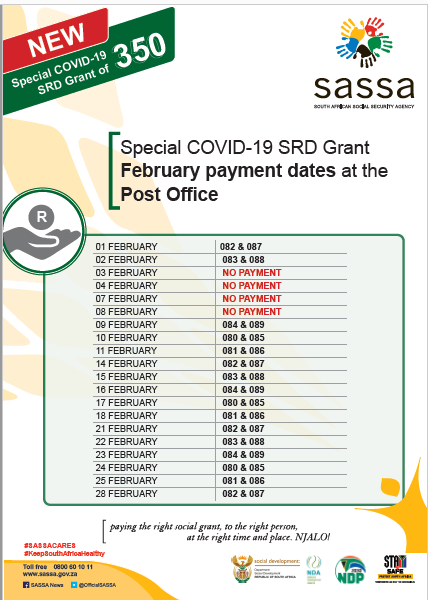 The Post Office has now released the R350 grant payment dates for January. SASSA Status Check for R350 Grant Payment Dates for February 2022 is on email protected to check online including being approved but receiving no pay. If you want to check your SASSA SRD R350 grant SRD R350 grant status these are the best way to follow and also check payment dates.